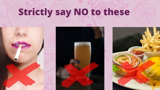 Smoking and alcohol should be totally avoided because smoking and alcohol, smoking specially will lead to growth retardation of the baby and can lead to pregnancy complications like premature rupture of membranes and premature delivery.